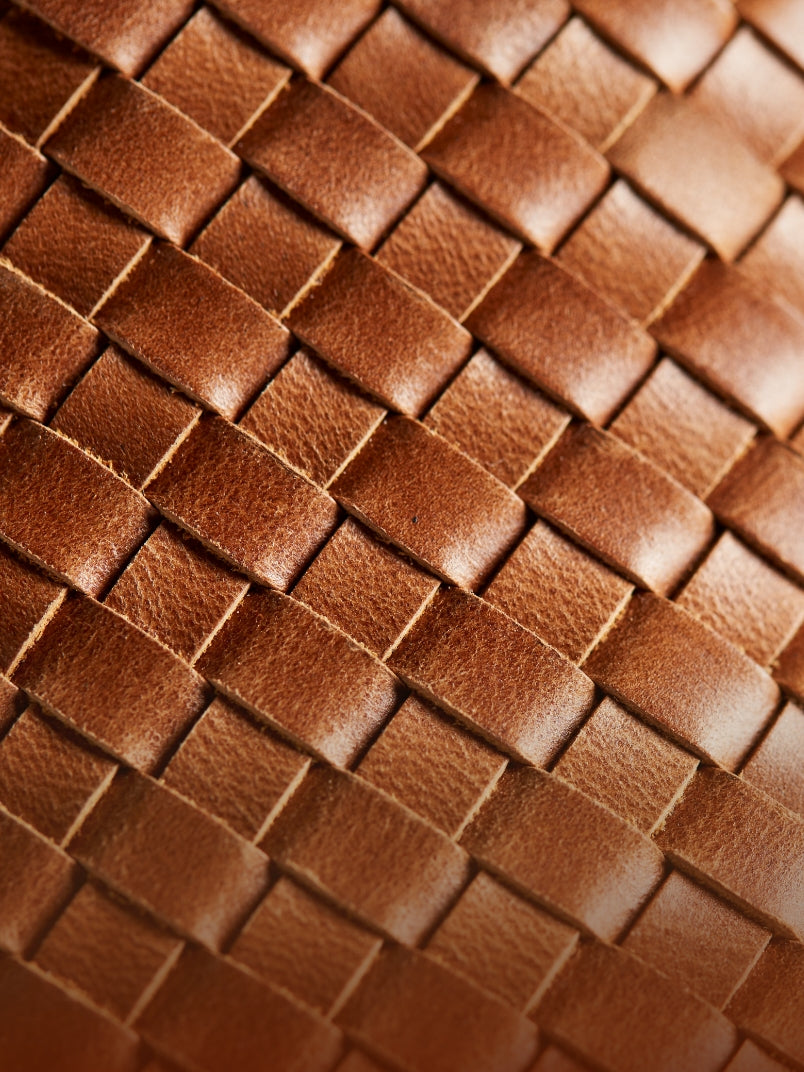 Lauhala Design: Antiqued and burnished leather woven into a traditional lauhala mat pattern for a sophisticated look.