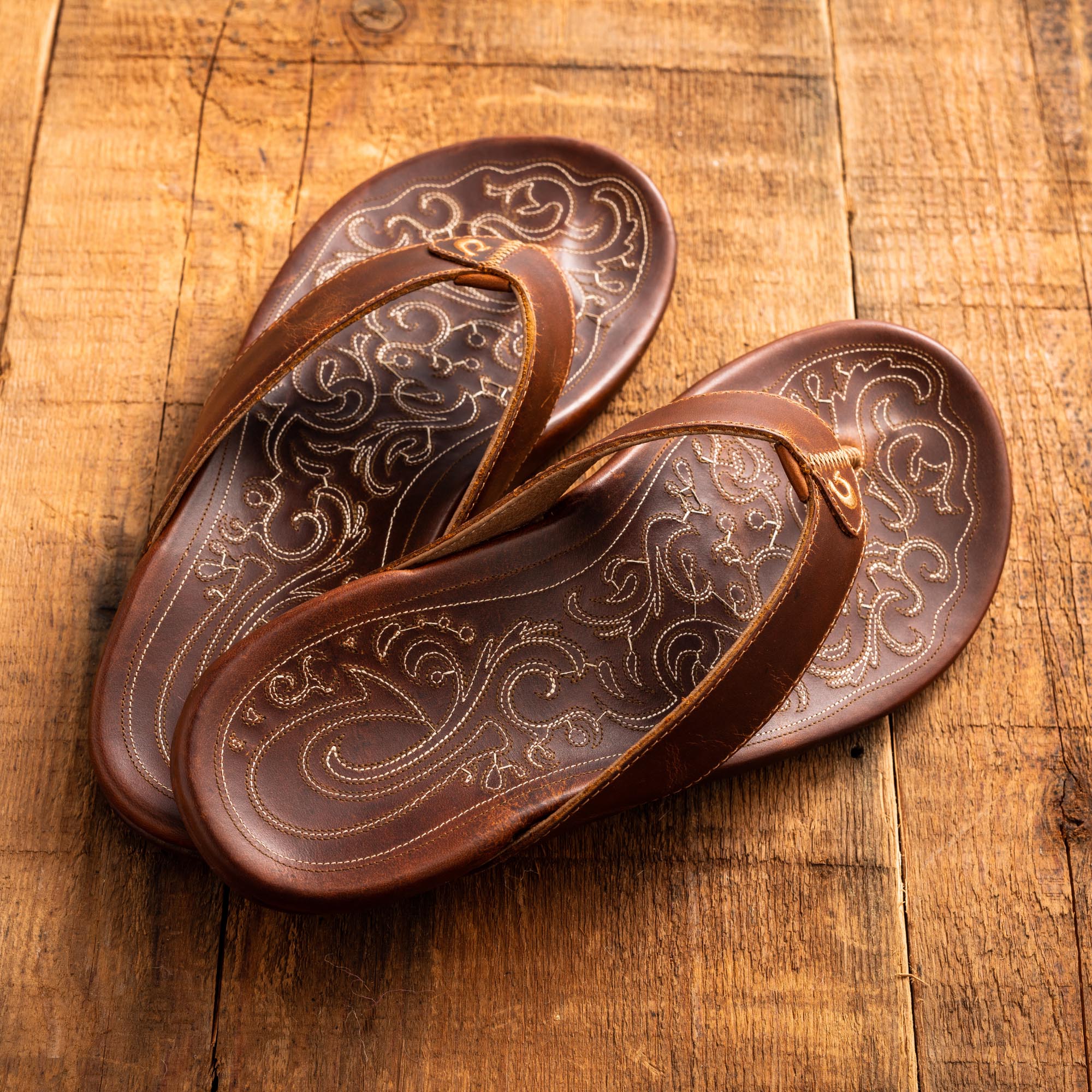 The Mekila pays homage to the Paniolo, the esteemed cowboys of Hawai‘i's upcountry, and the rich ranching culture that defines them. Crafted from high-character, full-grain leather and decorated with embroidery reminiscent of Hawaiian saddle stitching, this sandal showcases exceptional craftsmanship in every step. While it’s perfect for beach outings, it is best kept away from prolonged contact with water to preserve its quality.