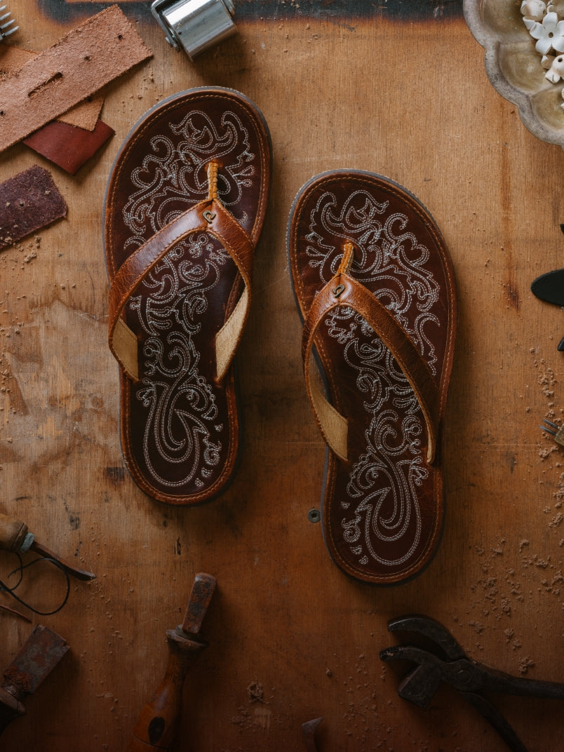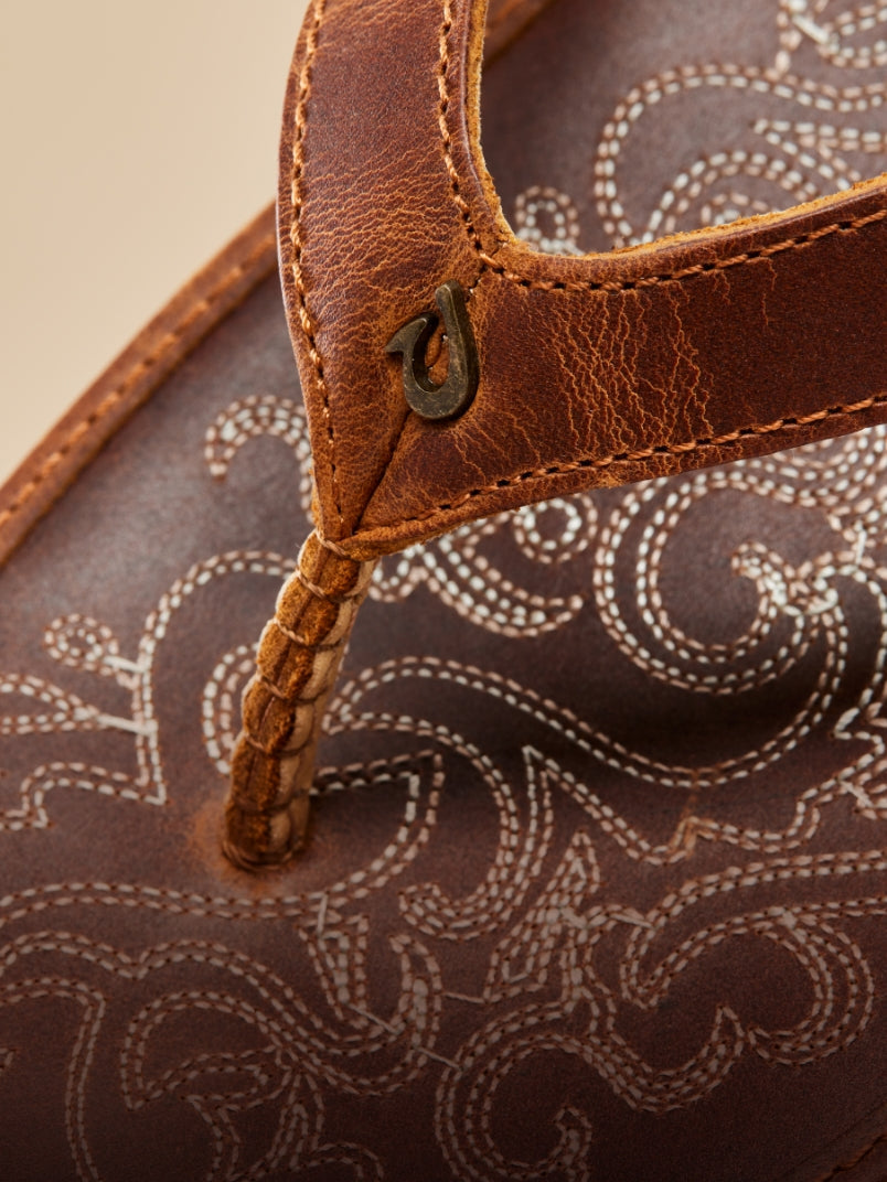 In 1833, Mexican vaqueros introduced Hawaiians to cattle management, giving rise to the vibrant paniolo (cowgirl) culture in Hawai‘i. Inspired by this heritage, our Paniolo sandal captures the spirit and aesthetic of these Hawaiian cowgirls with its saddle-inspired stitching and richly oiled leather. They’re perfect for around-town and out-of-town wear. Made for the beach, not the ocean—prolonged contact with water may cause damage.